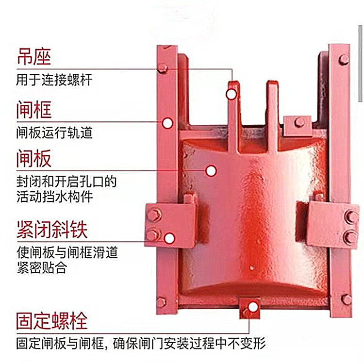 鑄鐵閘門一般設置有可調節的楔緊裝置,楔緊副(如楔塊與楔塊、楔塊與偏心銷等)分別設在門體和門框上。調節楔緊裝置,可使得閘門關閉時門體緊貼門框,達到止水要求。