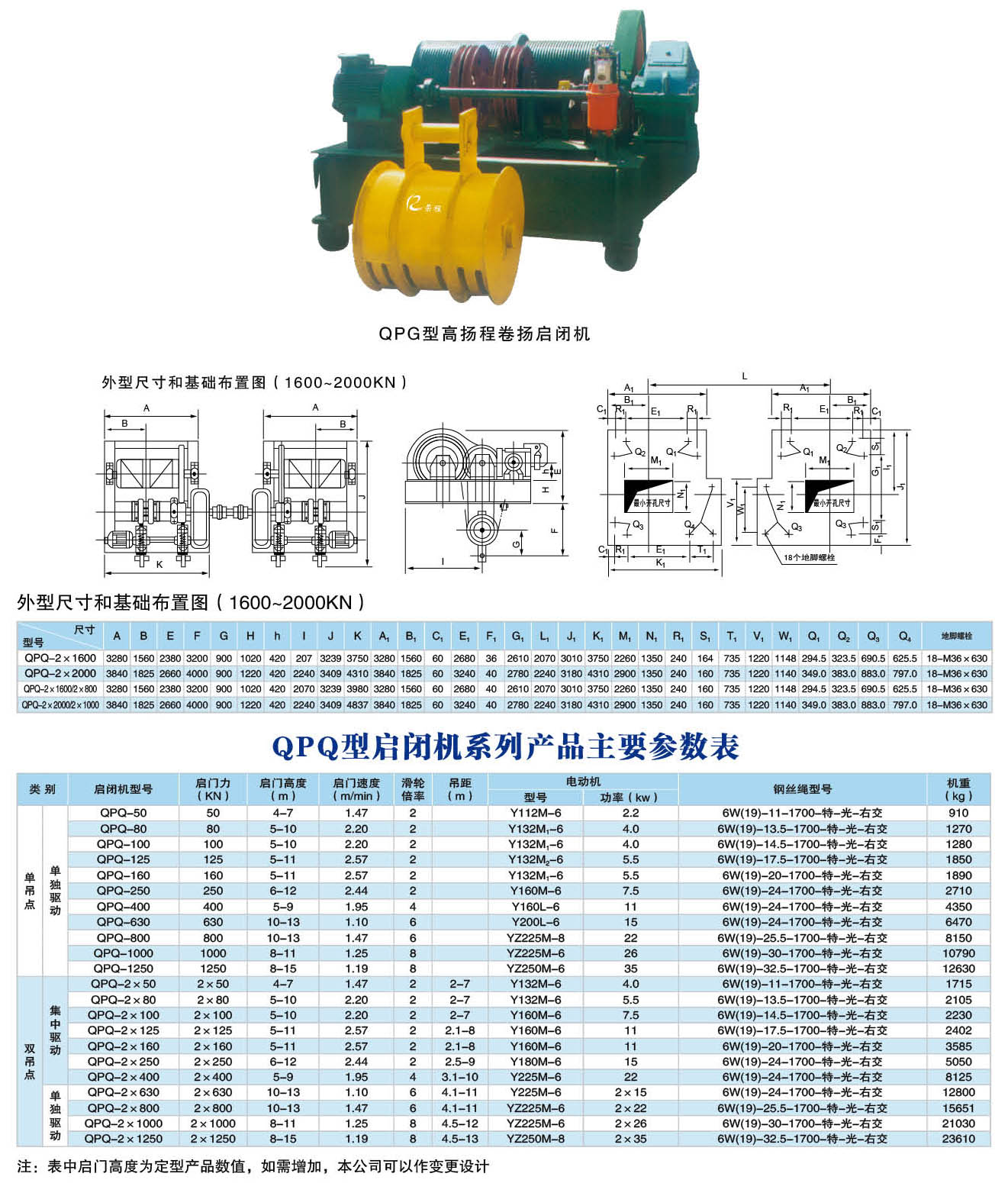 卷揚(yáng)啟閉機(jī)有多種型號:可以分為QPQ型普通卷揚(yáng)啟閉機(jī)、QPK型快速卷揚(yáng)啟閉機(jī)、QPG型高揚(yáng)程卷揚(yáng)啟閉機(jī)、QPT型臺(tái)車式卷揚(yáng)啟閉機(jī),QPM型門式卷揚(yáng)啟閉機(jī),QH型弧門卷揚(yáng)啟閉機(jī)。卷揚(yáng)啟閉機(jī)又分為:平門卷揚(yáng)式啟閉機(jī);弧形門卷揚(yáng)式啟閉機(jī);雙吊點(diǎn)卷揚(yáng)式啟閉機(jī);快速卷揚(yáng)式啟閉機(jī);移動(dòng)式臺(tái)車啟閉機(jī);雙吊點(diǎn)卷揚(yáng)式啟閉機(jī)分為:集中驅(qū)動(dòng)和單獨(dú)驅(qū)動(dòng)兩種;卷揚(yáng)式啟閉機(jī)手搖、電動(dòng)兩用式規(guī)格分為:5噸、8噸、12噸、16噸、25噸;電動(dòng)式規(guī)格分為:40噸、63噸、80噸、100噸、125噸、160噸、200噸,可以根據(jù)用戶要求設(shè)計(jì),并能生產(chǎn)雙吊點(diǎn)卷揚(yáng)式啟閉機(jī),該機(jī)是一種水利工程專用機(jī)械,廣泛用于水利工程閘門的啟閉,是農(nóng)田灌溉、水產(chǎn)養(yǎng)殖、農(nóng)業(yè)經(jīng)濟(jì)開發(fā)區(qū)、污水處理廠、水利發(fā)電站、水庫(水閘、堤壩、隧道、管 道)等進(jìn)水、退水閘的配套機(jī)械,山區(qū)、平原有、無電地區(qū)均可使用。