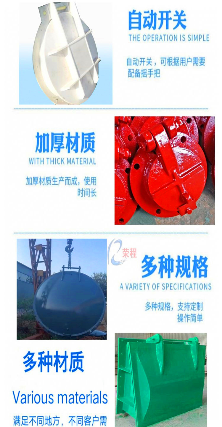 材質分為不銹鋼、鑄鐵、型鋼、復合材料(玻璃鋼)等多種材料,拍門又分為很多種,比如,浮箱式拍門,平板式拍門,套筒式拍門側翻拍門等等,可以做成懸掛式,單開門,雙開門,節(jié)能型根據客戶需要鑄造合適材質拍門,業(yè)務咨詢13582492022孫經理,微信同號。