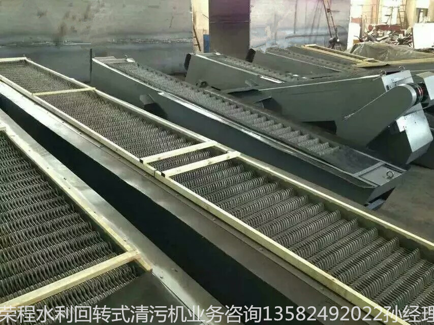 格柵除污機:由一種獨特的耙齒裝配成一組回轉鏈,在電機減速器的轉動下經,鏈輪傳動驅耙齒鏈,進行回轉運動;耙齒鏈的下部浸沒于排水溝槽中,當耙齒按工作方向運動時,每排橫軸耙齒即把液體中的固態顆粒或稱雜物,從液體中分離出來;按水流方向耙齒鏈類同于網柵,在耙齒鏈橫軸上裝配的柵隙可以根據不同條件進行選擇,當耙齒鏈反流體中的固態物質分離后可以保證水流暢通流過,整個工作過程是連續的。