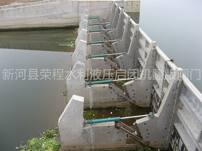 翻板閘門即為水力自控翻板閘門,其工作原理是杠桿平衡與轉動,具體來說,水力自控翻板閘門是利用水力和閘門重量相互制衡,通過增設阻尼反饋系統來達到調控水位的目的:當上游水位升高則閘門繞“橫軸”逐漸開啟泄流;反之,上游水位下降則閘門逐漸回關蓄水,使上游水位始終保持在設計要求的范圍內。舉個例子,滾輪連桿式翻板閘門是一種雙支點帶連桿的閘門,由面板、支腿、支墩、滾輪,連桿等部件組成,根據閘門水位的變化,依靠水力作用自動控制閘門的開啟和關閉。當上游來流量加大,閘門上游水位抬高,動水壓力對支點的力矩大于門重與各種阻尼對支點的力矩時,閘門自動開啟到一定傾角,直到在該傾角下動水壓力對支點的力矩等于門重支點的力矩,達到該流量下新的平衡。流量不變時,開啟角度也不變。而當上游流量減少到一定程度,使門重對支點的力矩大于動水壓力與各種阻尼對支點的力矩時,水力自控翻板閘門可自行回關到一定傾角,從而又達到該流量下新的平衡。